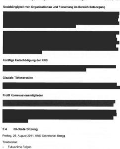 Schlicht schwarz sieht der interessierte Bürger in den Protokolleinträgen zur Atomkatastrophe in Japan: Seitenweise zieren dicke Balken das Protokoll. Das Wenige, was über die Diskussionen des Fachgremiums zu Fukushima zu erfahren ist, findet sich auch hier in der Traktandenliste. So liess sich die KNS am 23. März durch einen Spezialisten für Systemtechnik des Ensi zum ersten Mal über die Umstände des Unglücks informieren (eine Protokollseite, vollständig eingeschwärzt). Am 8. April begnügte man sich mit einer kurzen Orientierung (fünf Zeilen, schwarz). Die «Folgemassnahmen in der Schweiz» und das weitere Vorgehen beriet die Kommission am 20. Mai und am 24. Juni. Am 26. August schliesslich diskutierte die Kommission über Lehren aus dem Unglück und über die Erdbebengefährdung der Schweiz, zudem war Ensi-Direktor Hans Wanner zu Gast. Auch bei den ausgehändigten Protokollen zu all diesen Sitzungen gilt: Inklusive Fussnoten ist alles zensuriert.