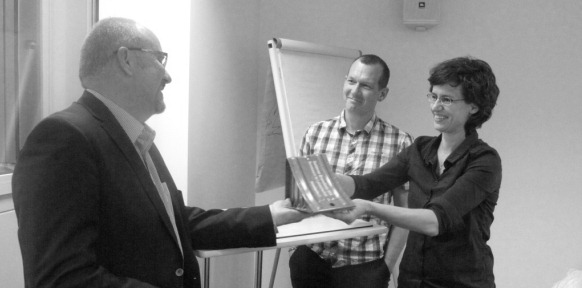 Dominique Strebel und Stefanie Hablützel, Co-Präsidenten von investigativ.ch, übergeben Jürg Jordi vom Bundesamt für Landwirtschaft den Schmähpreis.