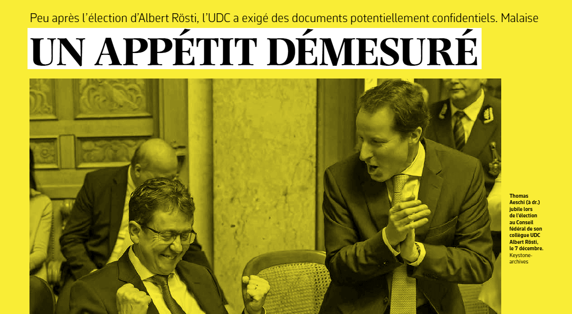 Unmittelbar nach Bundesrat Albert Röstis Amtsantritt verlangt die SVP Einsicht in aktuelle UVEK-Geschäfte. Von «La Liberté» mit dem Öffentlichkeitsgesetz herausgelangte E-Mails zeigen die beharrliche Forderung von Parteichef Thomas Aeschis nach vertraulich geltenden Dokumenten. Andere Parteien bezeichnen dieses Vorgehen als ungewöhnlich und zu aggressiv. |