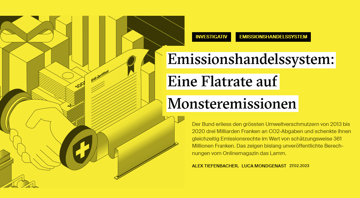 Von 2013 bis 2020 erlässt der Bund den Top-Umweltverschmutzern 3 Mrd. CHF CO2-Abgaben und vergibt Emissionsrechte für 361 Mio. CHF. «Das Lamm» enthüllt mittels Öffentlichkeitsgesetz, welche Unternehmen überschüssige Gratiszertifikate profitabel verkaufen. Fazit: Vor allem Grosskonzerne zahlen in den letzten Jahren wenig bis nichts für ihre Emissionen. |