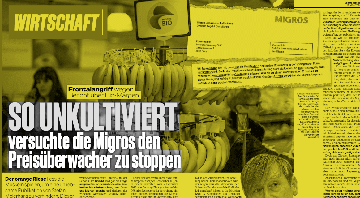 Die Untersuchung des Preisüberwachers zu Bio-Margen findet unter starkem juristischem Druck von Migros statt. «Schweiz am Wochenende» und der «Sonntagsblick» verlangen unabhängig voneinander Dokumente. Diese zeigen, wie der Preisüberwacher unter Druck gesetzt wird. Insgesamt verlangt Migros 53 Berichtigungen. |