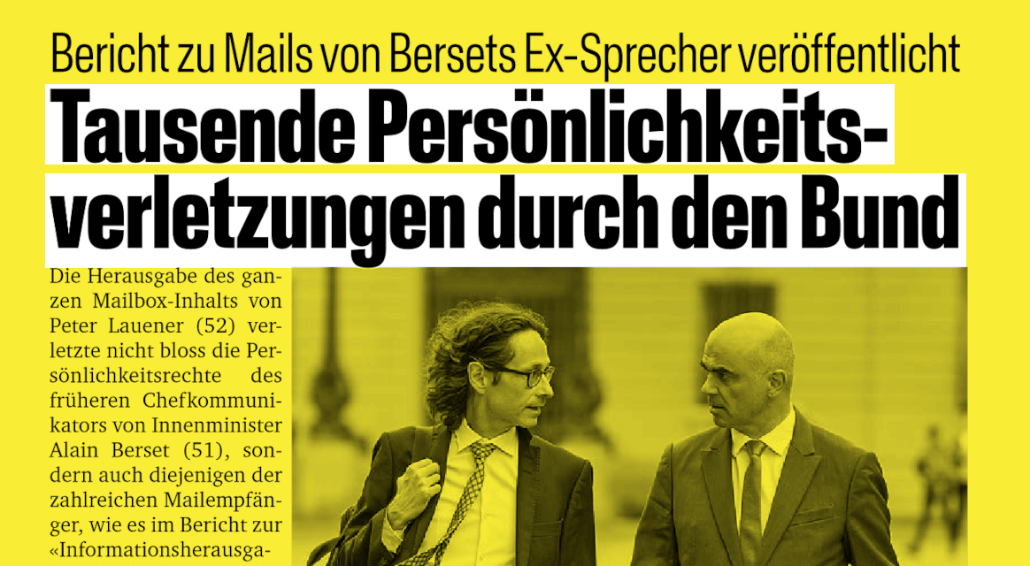 Das Bundesamt für Informatik (BIT) gibt im Rahmen einer Untersuchung zu Indiskretionen beim Bund E-Mails von Peter Lauener, dem Ex- Kommunikationschef von Alain Berset, heraus. Dabei werden Persönlichkeitsrechte Tausender Unbeteiligter verletzt. Zu diesem Schluss kommt ein Bericht des Finanzdepartements, den «Blick» mit dem Öffentlichkeitsgesetz einfordert. |