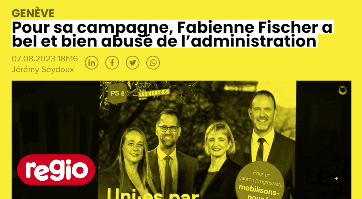 Fabienne Fischer, ehemalige Genfer Staatsrätin, lässt für ihre Wahlkampagne Verwaltungsmitarbeitende arbeiten. Durch E-Mails und Kalender, die der Kantonsparlamentarier Daniel Sormanni via Öffentlichkeitsgesetz erhält und «Léman Bleu» zugänglich macht, kommt ans Licht, dass sie Departementsressourcen für die Führung ihres Wahlkampfs nutzt. |