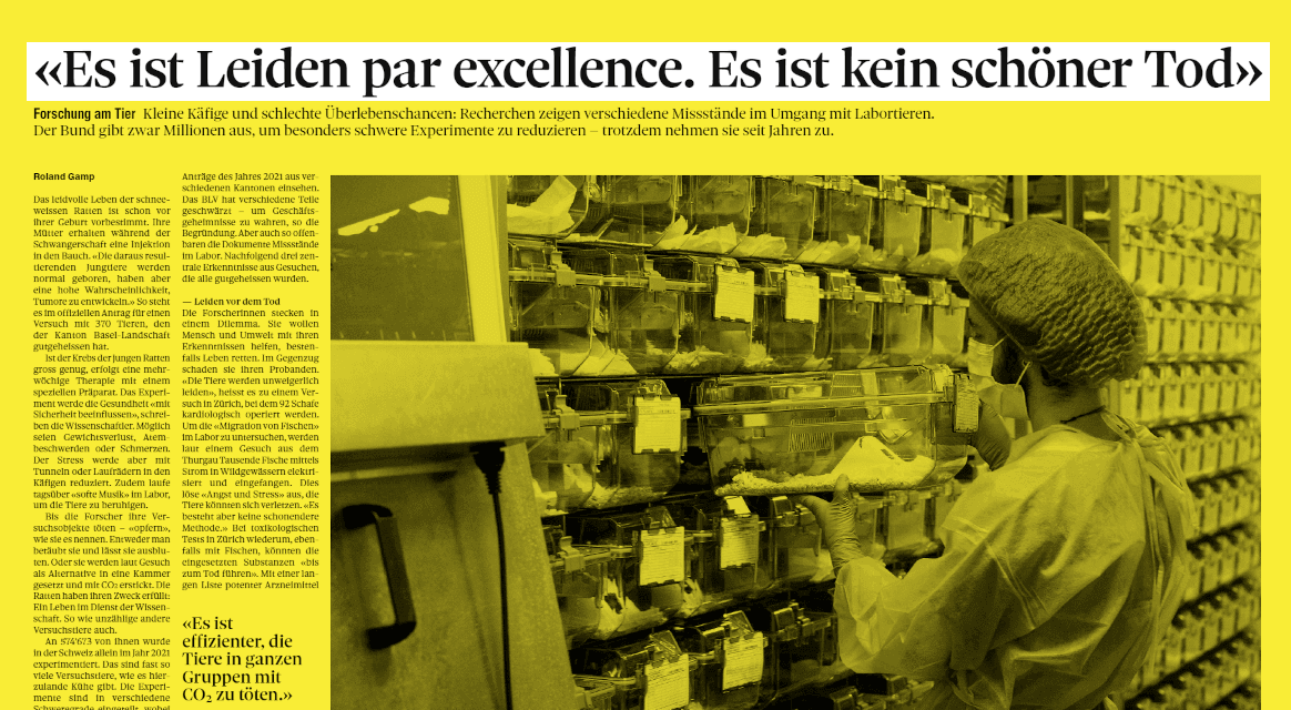 Trotz Millioneninvestitionen des Bundes steigt die Anzahl schwerer Tierversuche. Der «Tages-Anzeiger» verlangt auf Basis des Öffentlichkeitsgesetzes Dokumente zu Tierversuchen. Diese zeigen, dass Tiere qualvoll verenden und unbeschadete Tiere nach Experimenten getötet werden. Zudem sind die Platzverhältnisse für die Lebewesen in Versuchslabors prekär. |