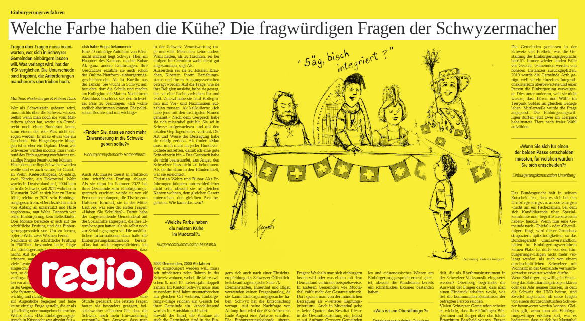 Eine Recherche der Lokalzeitung «Freier Schweizer» enthüllt, dass Schwyzer Gemeinden Einbürgerungswilligen teils kuriose Fragen stellen: «Welche Farbe haben die meisten Kühe im Muotatal?». Zuerst verweigerten die meisten Gemeinden Einblick in ihren Fragenkatalog. Nach hartnäckigem Nachfragen geben zwei Drittel nach. Einige, wie Einsiedeln und Freienbach, weigern sich standhaft. |