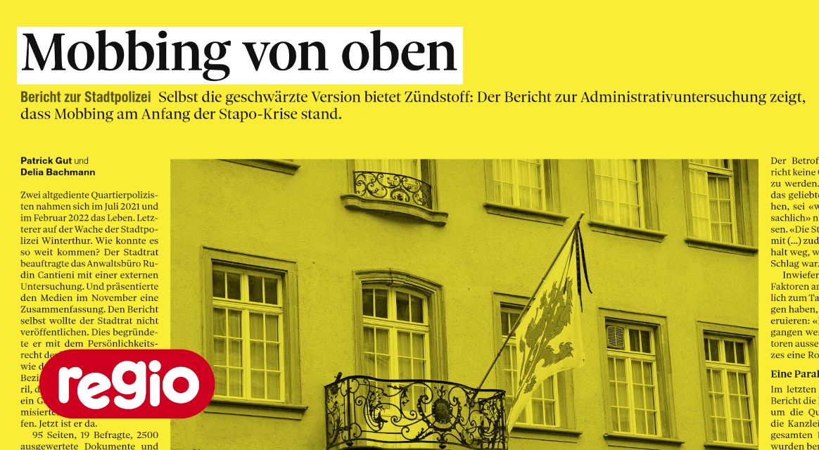2022 untersucht Winterthur mehrere Suizide bei der Stadtpolizei. Der «Landbote» verlangt gestützt auf das Öffentlichkeitsgesetz Einblick in den 95-seitigen Bericht zur Administrativuntersuchung und bekommt diesen nach einem Rechtsverfahren zugestellt. Im geschwärzten Bericht ist von einer hierarchischen Führungskultur und Mobbing die Rede. Der Bericht nennt verschiedene Missstände beim Namen, jedoch keine Verantwortlichen. |