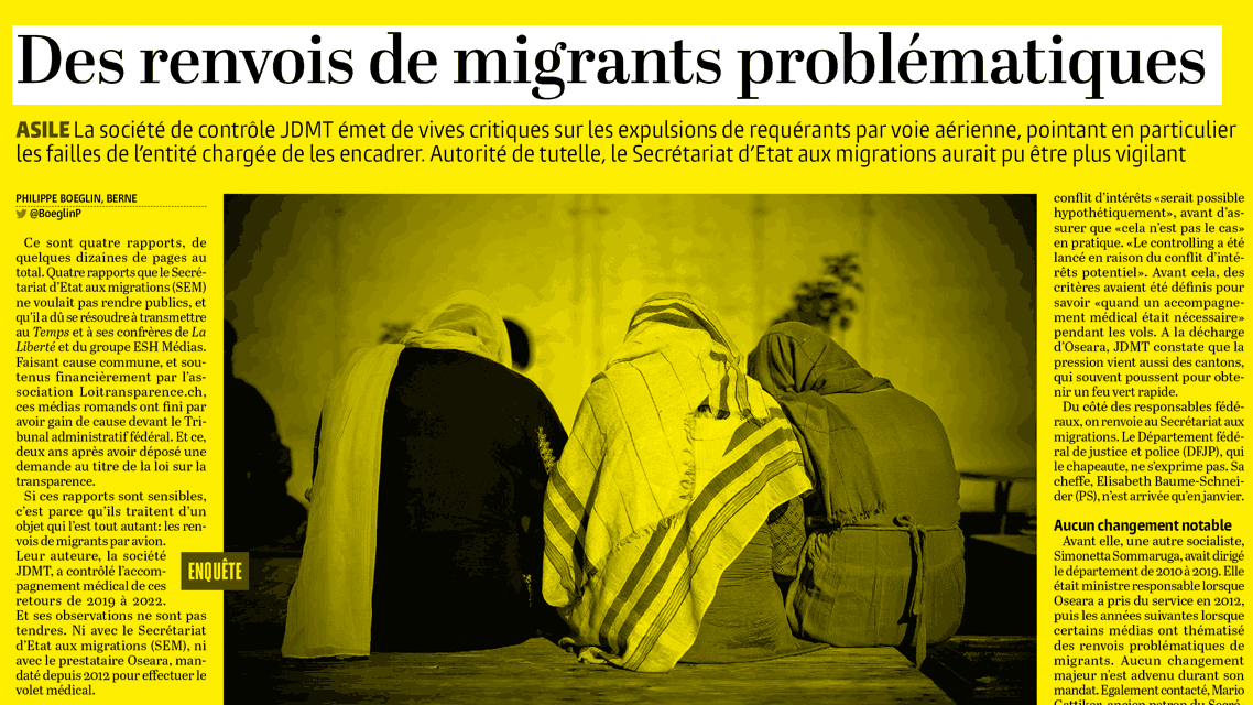 Nach einem zweijährigen Rechtsstreit gibt das Staatssekretariat für Migration (SEM) Berichte über die medizinische Versorgung auf Ausschaffungsflügen heraus. Gestützt auf das Öffentlichkeitsgesetz haben «Le Temps», «La Liberté» und die ESH-Mediengruppe Zugang verlangt. Die Dokumente zeigen gravierende Mängel in der medizinischen Begleitung von Migrantenrückführungen. |