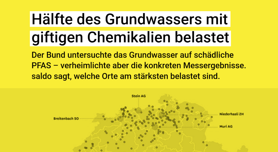 Eine unter Verschluss gehaltene Untersuchung des Bundesamtes für Umwelt, basierend auf 22.000 Messdaten, zeigt PFAS-Belastungen im Grundwasser. Potenziell krebserregende PFAS, per- und polyfluorierte Alkylsubstanzen, kommen in der Schweiz in jeder zweiten Wasserprobe vor. Die Messergebnisse verlangt «Saldo» gestützt auf das Öffentlichkeitsgesetz heraus. |