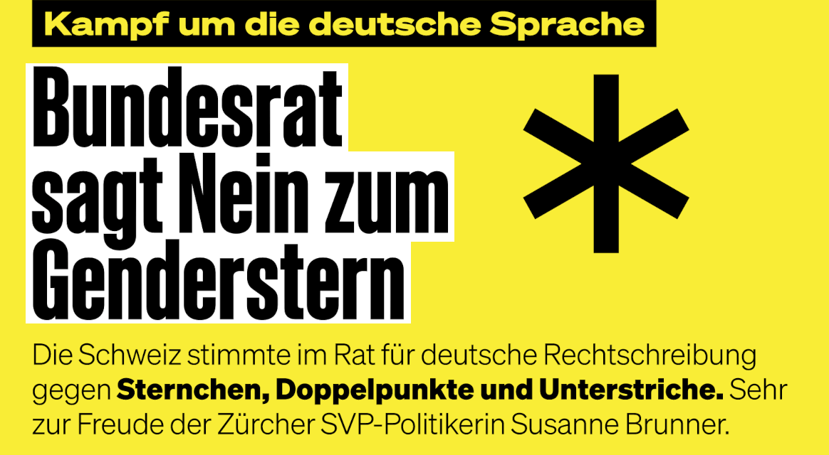 Bislang war nicht bekannt, wie sich der Bund im Rat für deutsche Rechtschreibung zum Reizthema Genderstern verhält. Nun zeigen neue Recherchen: Bern stimmte im Rechtschreibrat gegen das genderneutrale Symbol mitten im Wort: «Der Schweizerische Bundesrat hat wiederholt festgehalten, dass er die Verwendung von Sonderzeichen zur Markierung der Geschlechtsidentität aufgrund sprachlicher, sprachpolitischer und rechtlicher Probleme für nicht geeignet hält, das Anliegen einer inklusiven Sprache in den Texten des Bundes umzusetzen.» So steht es in einem Dokument, das «Sonntagsblick» unter Berufung auf das Öffentlichkeitsgesetz einsehen konnte.