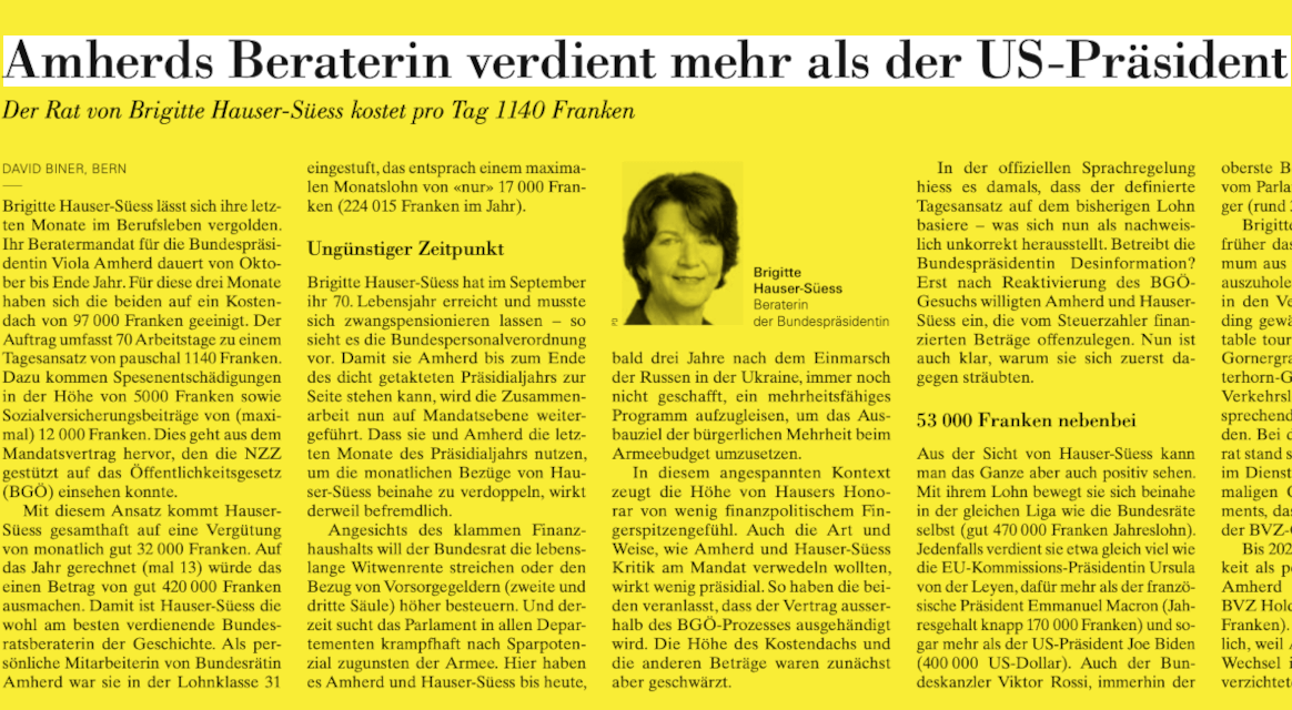 Zuerst sollte es geheim bleiben, jetzt ist klar: Der Rat von Brigitte Hauser-Süess kostet pro Tag 1140 Franken. Die Art und Weise, wie Amherd und Hauser-Süess Kritik am Mandat verwedeln wollten, wirkt wenig präsidial. So haben die beiden veranlasst, dass der Vertrag ausserhalb des BGÖ-Prozesses ausgehändigt wird. Die Höhe des Kostendachs und die anderen Beträge waren zunächst aber geschwärzt. In der offiziellen Sprachregelung hiess es damals, dass der definierte Tagesansatz auf dem bisherigen Lohn basiere – was sich nun als nachweislich unkorrekt herausstellt. Als persönliche Mitarbeiterin von Bundesrätin Amherd war sie in der Lohnklasse 31 eingestuft, das entsprach einem maximalen Monatslohn von «nur» 17 000 Franken (224 015 Franken im Jahr). Für den dreimonatigen Mandatsvertrag haben sich die beiden nun auf ein Kostendach von 97 000 Franken geeinigt. Mit Spesen und Sozialversicherungsbeiträgen kommt das auf ein Gehalt von rund 420'000 Franken pro Jahr. Damit ist Hauser-Süess die wohl am besten verdienende Bundesratsberaterin der Geschichte.