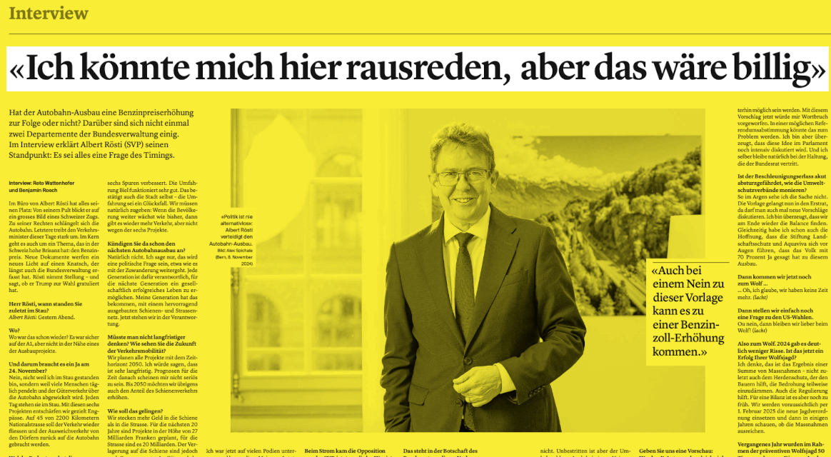 Hat der Autobahn-Ausbau eine Benzinpreiserhöhung zur Folge oder nicht? Darüber sind sich nicht einmal zwei Departemente der Bundesverwaltung einig. Demnach hat die Eidgenössische Finanzverwaltung (EFV) in der Ämterkonsultation des Abstimmungsbüchleins den Formulierungen aus dem Departement Rösti direkt widersprochen. Ursprünglich stand dort, die geplanten sechs Projekte könnten ohne neue oder zusätzliche Mittel aus dem Nationalstrassen- Fonds (NAF) finanziert werden. Dies stimme nicht mit der aktuellen Finanzplanung überein, schrieb die EFV – zwei Passagen wurden geändert. Die Formulierung lautet nun, «aktuell» verfüge der Fonds über genügend Mittel. Eine Erhöhung des Mineralölzuschlags hält die EFV gemäss den Dokumenten für «wahrscheinlich». Bundesrat Rösti nimmt in diesem Beitrag u.a. auch zu dieser Frage Stellung.