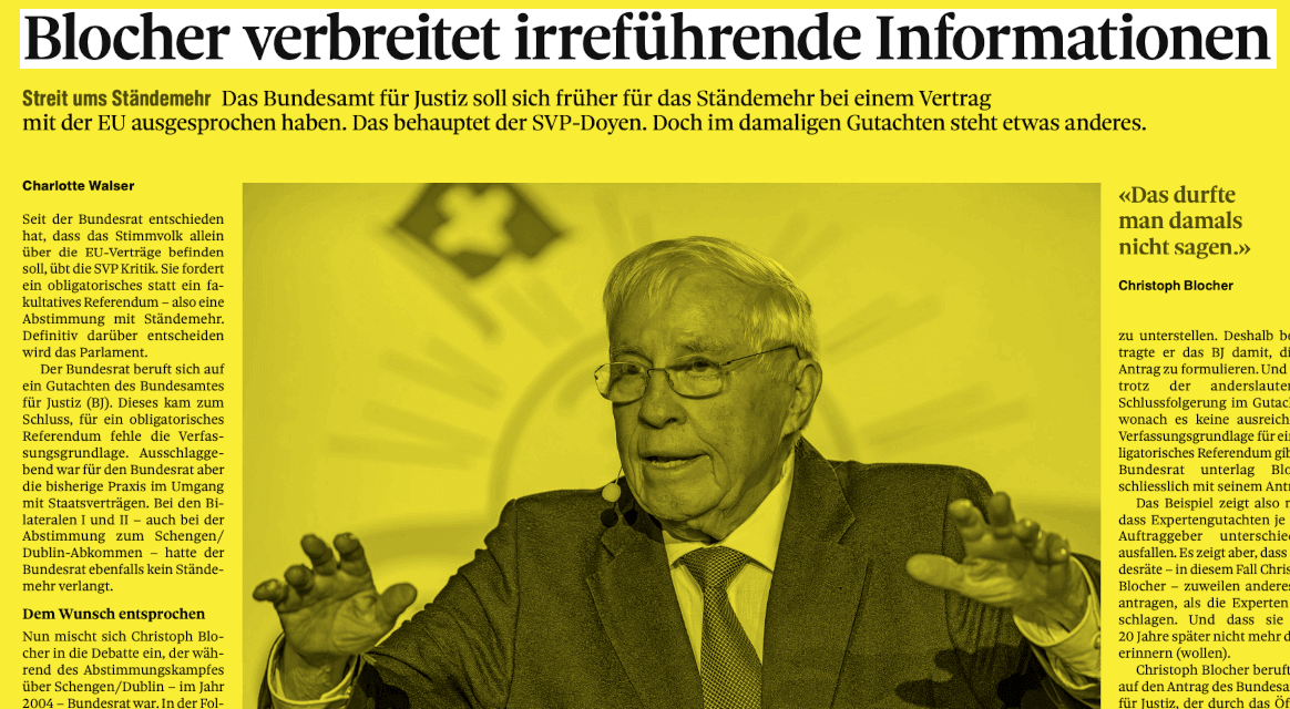 Christoph Blocher behauptete kürzlich, das Bundesamt für Justiz (BJ) habe 2004 das obligatorische Referendum mit Ständemehr für das Schengen/Dublin-Abkommen empfohlen, der Bundesrat habe dies aber verschwiegen. Auf Wunsch von SVP-Fraktionschef Thomas Aeschi wurde nun ein entsprechender Bericht veröffentlicht. Dieser zeigt jedoch, dass die interdepartementale Arbeitsgruppe unter Leitung des BJ damals zum Schluss kam, es fehle an einer ausreichenden Verfassungsgrundlage für ein obligatorisches Referendum. Christoph Blocher beruft sich jedoch auf den damaligen Antrag des BJ, der gestützt auf das Öffentlichkeitsgesetz eingesehen werden konnte. Darin schreibt das BJ: «Gemäss Ihrem Auftrag unterbreiten wir Ihnen in der Anlage den Entwurf eines Mitberichts. Darin schlagen wir vor, das Abkommen Schengen/Dublin dem obligatorischen Referendum zu unterstellen.» Der Schluss liegt nahe, dass dieser Antrag auf Auftrag Blochers erfolgte.