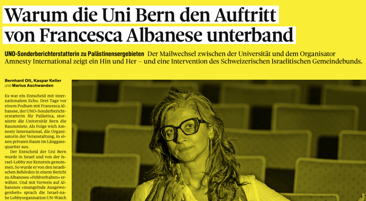 Am. 30. Juni 2025 plante Amnesty International mit der UNO-Sonderberichtserstatterin für die besetzten palästinensischen Gebiete. Die Podiumsdiskussion sollte in einem Raum der Universität Bern stattfinden. Drei Tage vor der geplanten Veranstaltung hat die Universität Bern die Bewilligung für die Raummiete storniert. Gestützt auf das bernische Informationsgesetz hat die Tamedia-Redaktion Einblick in den Mailverkehr der Universitätsleitung im Vorfeld der Veranstaltung verlangt. Daraus geht hervor, dass zwischen der Universität Bern und Amnesty International ein mehrmaliges Hin und Her erfolgte. Am Tag der Absage flatterte zudem ein E-Mail vom Generalsekretär des Schweizerischen Israelitischen Gemeindebunds bei der Rektorin der Universität Bern herein. Dieser warf Albanese vor, sie sei «immer wieder mit antisemitischen und terrorverherrlichenden Aussagen aufgefallen».