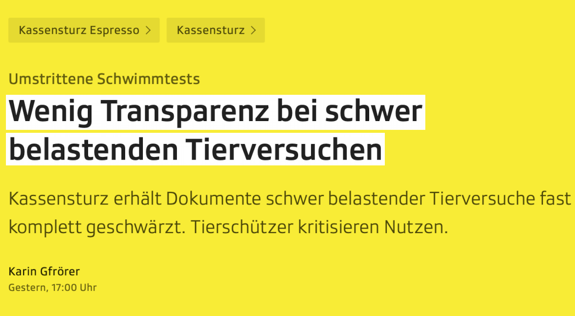 «Kassensturz» verlangte gestützt auf das Öffentlichkeitsgesetz Einsicht in mehrere aktuelle Anträge zu Tierversuchen im höchsten Schweregrad. Die erhaltenen Unterlagen waren jedoch fast vollständig geschwärzt, sodass weder ersichtlich war, wo noch von wem die Versuche durchgeführt wurden. Das Bundesamt für Lebensmittelsicherheit und Veterinärwesen begründete dies mit vertraulichen Informationen und Zeitmangel. Kritiker wie Gieri Bolliger von der Stiftung Tier im Recht bemängeln, dass dadurch wesentliche Angaben zu Ziel und Belastung der Tiere fehlen und eine öffentliche Meinungsbildung verunmöglicht wird. Ein Antrag betraf schwer belastende Versuche an sieben Affen, über deren Ziel nichts erkennbar ist. Ein anderer Antrag – teilweise lesbarer – behandelte den umstrittenen «Forced Swim Test» mit Mäusen, bei dem die Tiere sechs Minuten lang schwimmen müssen. Während Tierschützer den Erkenntnisgewinn bezweifeln und den Test als Tierquälerei kritisieren, wird er an Schweizer Hochschulen wie der ETH weiterhin durchgeführt und mit wissenschaftlichem Nutzen begründet.