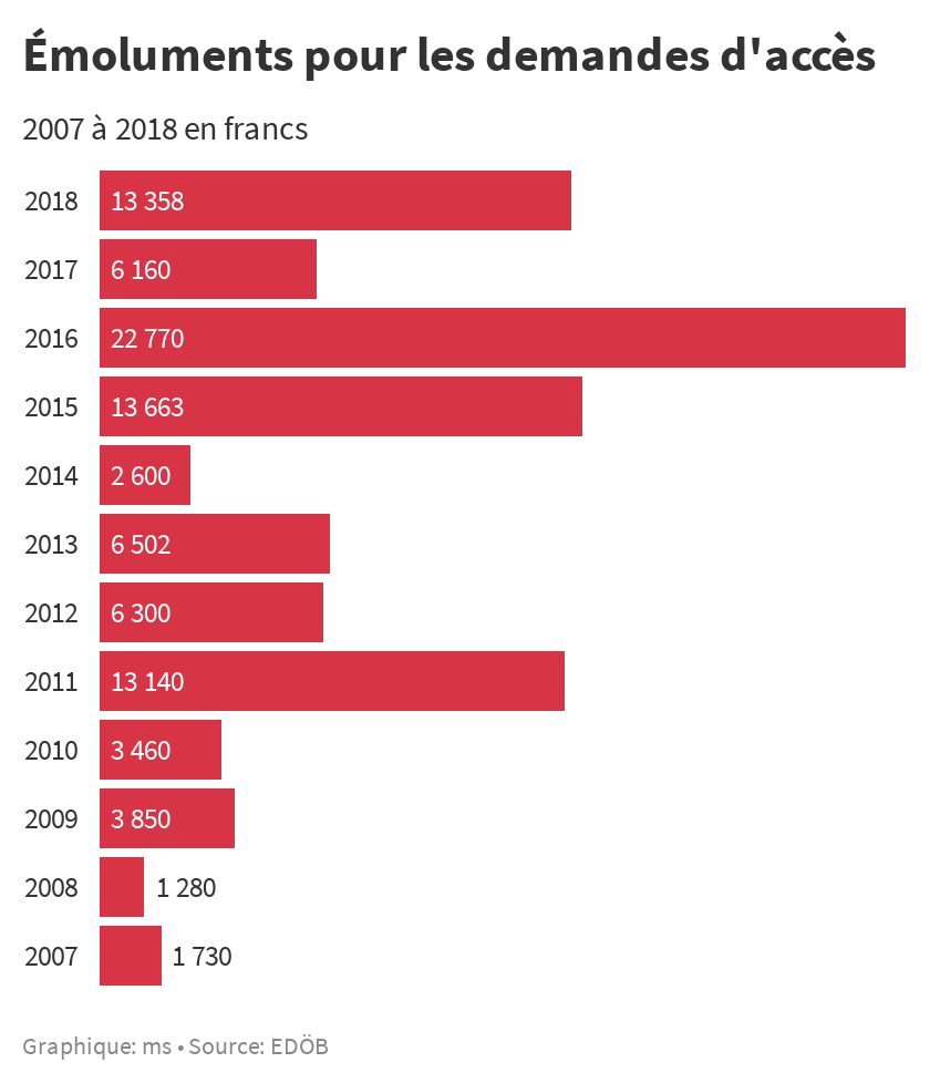 Selon le préposé fédéral à la protection des données et à la transparence (PFPDT), les autorités n’ont prélevé d’émoluments que pour 2,6% de toutes les demandes de l’année 2017/18. Ces frais se sont montés à 13 358 francs (en moyenne 785 francs par demande). Les années précédentes, les montants facturés aux demandeurs étaient pour la plupart moins élevés.